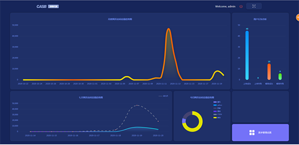 云訪問統(tǒng)計模塊:云訪問安全代理(CASB)的云訪問統(tǒng)計模塊記錄了所有云使用者的互聯(lián)網訪問情況并以餅狀圖和柱狀圖的形式向管理者展示,并向管理者發(fā)出未知或已知的風險行為及未知云訪問的風險預警。