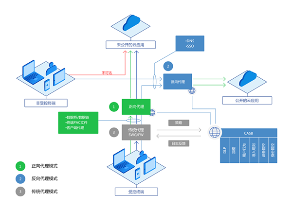 CASB公有云傳統(tǒng)代理模式可在公有云環(huán)境搭建相應的代理服務,滿足企業(yè)在該使用場景下數據安全管控需求。