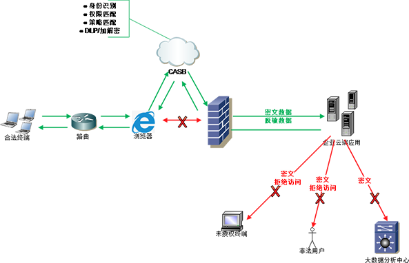 用戶在使用云服務或云應用的過程中,其數據必然會進入服務商的系統(tǒng)中,隨著出現了用戶與服務商之間的信任問題。尤其是具備高度隱私屬性的數據,云存儲會帶來極高的風險,如金融業(yè)、醫(yī)療業(yè)等。類似行業(yè)的數據隱私屬性極高,如果直接上云會帶來極大的泄漏風險,因此需要使用云訪問安全代理(CASB)來幫助實現規(guī)范云上數據的合規(guī)性和安全性。