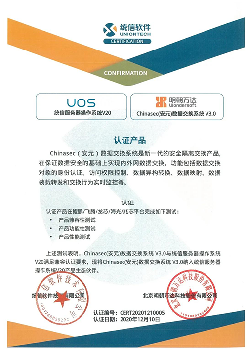 Chinasec(安元)數(shù)據(jù)交換系統(tǒng)V3.0與統(tǒng)信服務(wù)器操作系統(tǒng)V20兼容認(rèn)證證書