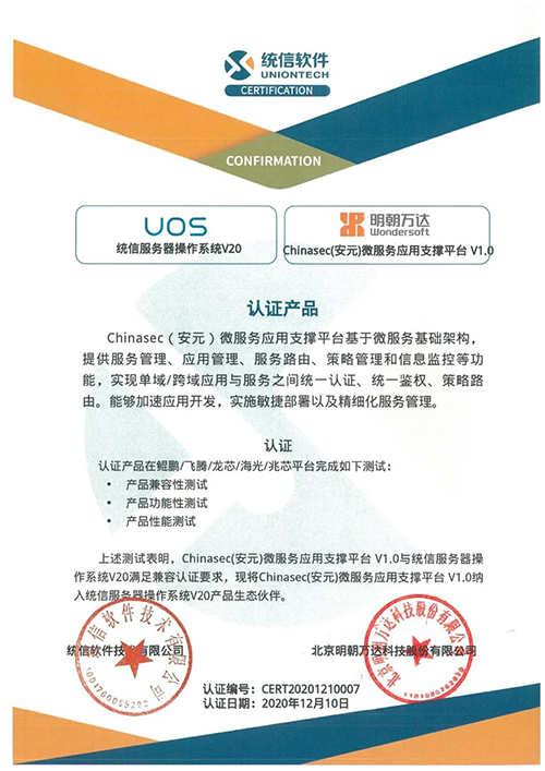 Chinasec(安元)微服務(wù)應(yīng)用支撐平臺(tái)V1.0與統(tǒng)信服務(wù)器操作系統(tǒng)V20兼容認(rèn)證證書