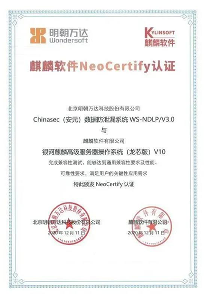 Chinasec(安元)數(shù)據(jù)防泄漏系統(tǒng)WS-NDLP/V3.0與銀河麒麟高級(jí)服務(wù)器操作系統(tǒng)(龍芯版)V10兼容認(rèn)證證書