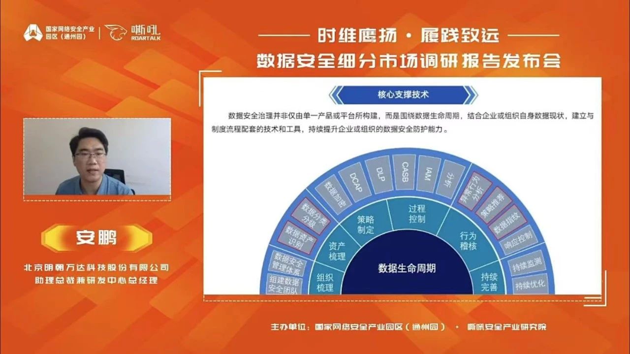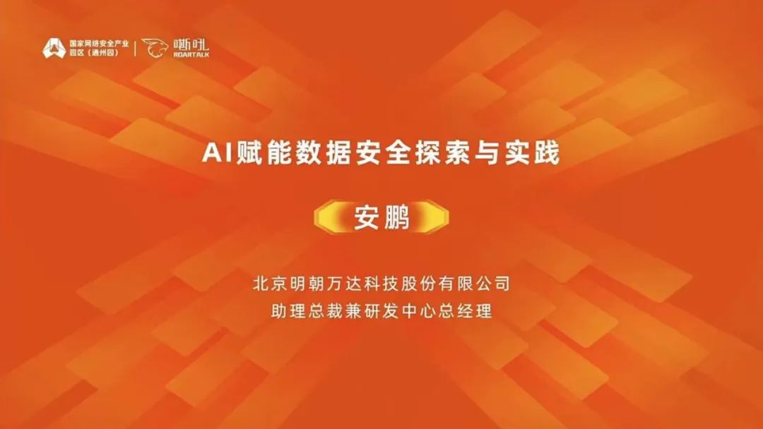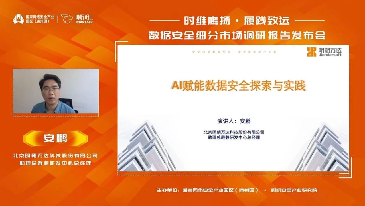 北京明朝萬達科技股份有限公司作為深度參與該報告調(diào)研的企業(yè)受邀參加會議,助理總裁兼研發(fā)中心總經(jīng)理安鵬在線發(fā)表“AI賦能數(shù)據(jù)安全探索與實踐”主題演講。