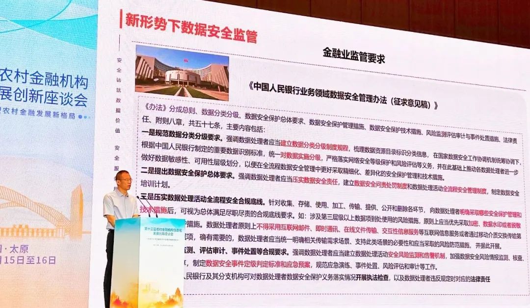 大會(huì)開(kāi)幕當(dāng)天,北京明朝萬(wàn)達(dá)科技股份有限公司金融事業(yè)部副總經(jīng)理孫加光受邀出席上午的“加快數(shù)字化轉(zhuǎn)型,賦能農(nóng)村金融高質(zhì)量發(fā)展”主題會(huì)議,并發(fā)表演講。和與會(huì)的專(zhuān)家領(lǐng)導(dǎo)、行業(yè)同仁們分享明朝萬(wàn)達(dá)全流程數(shù)據(jù)安全建設(shè)方案,介紹了明朝萬(wàn)達(dá)在金融行業(yè)數(shù)據(jù)安全領(lǐng)域的深入探索以及取得的亮眼成績(jī)。