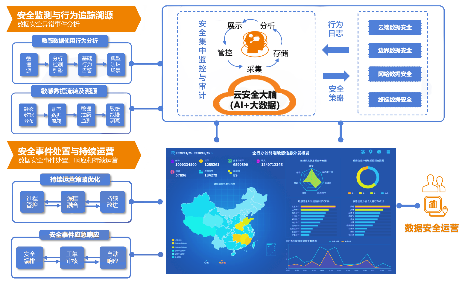 產(chǎn)品系列由安元終端DLP、網(wǎng)絡DLP、郵件DLP、存儲DLP,數(shù)據(jù)交換系統(tǒng),數(shù)據(jù)庫審計、脫敏系統(tǒng),安全接入網(wǎng)關、CASB,商務密郵(移動端),集中監(jiān)測與審計分析系統(tǒng)組成。在數(shù)據(jù)分類分級基礎上,以集中監(jiān)測與審計分析系統(tǒng)為核心,聯(lián)動端、邊、網(wǎng)、云各端子系統(tǒng)。產(chǎn)品系列通過各子系統(tǒng)產(chǎn)品提供采集、監(jiān)測和管控響應能力,由集中監(jiān)測與審計分析系統(tǒng)對行為數(shù)據(jù)進行審計和分析,通過建立數(shù)據(jù)安全行為基線,識別異常行為,對風險行為聯(lián)動子系統(tǒng)產(chǎn)品自動下發(fā)安全防護劇本,提供一站式數(shù)據(jù)安全治理方案,實現(xiàn)對數(shù)據(jù)生命周期過程中的自適應風險識別,精準防護,動態(tài)響應,防患于未然。