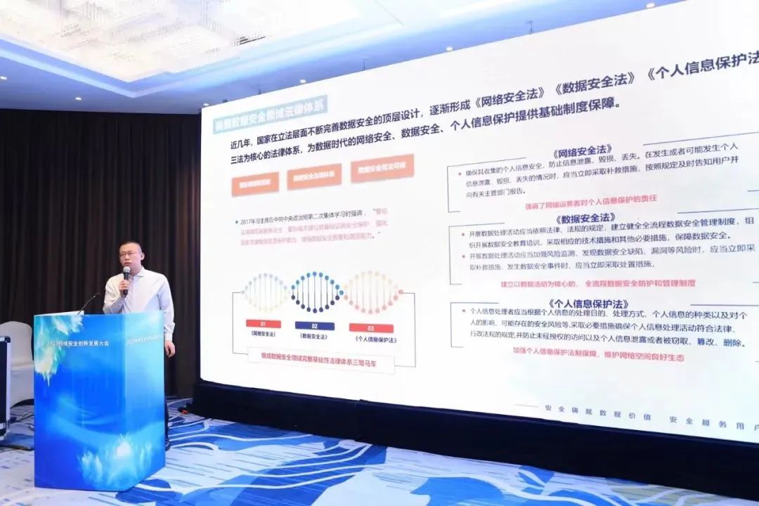 演講以“金融行業(yè)數(shù)據(jù)安全治理體系建設(shè)與實踐”為主題,介紹了數(shù)字經(jīng)濟(jì)中,數(shù)據(jù)要素的價值,以及數(shù)據(jù)安全方面新的高度。國家對于立法層面也逐漸形成《網(wǎng)絡(luò)安全法》《數(shù)據(jù)安全法》《個人信息保護(hù)法》三法為核心的法律體系。三大體系也為數(shù)據(jù)時代的網(wǎng)絡(luò)安全、數(shù)據(jù)安全、個人信息保護(hù)提供基礎(chǔ)制度保障。同時,金融行業(yè)也從監(jiān)管標(biāo)準(zhǔn)等方面推動數(shù)據(jù)安全體系落地,中國人民銀行會同金融監(jiān)管部門制定并形成了《金融數(shù)據(jù)安全分級指南》、《數(shù)據(jù)生命周期安全規(guī)范》、《數(shù)據(jù)安全評估規(guī)范》的金融行業(yè)數(shù)據(jù)安全規(guī)范的三大標(biāo)準(zhǔn)。