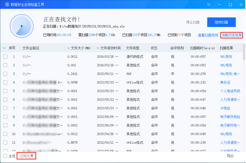 對終端所有數(shù)據(jù)進(jìn)行解析與內(nèi)容掃描,對于命中的敏感文件,可采用快速隔離、集中加密管理等方式進(jìn)行合規(guī)處置。對于歷史掃描結(jié)果,支持二次加載、查看和對比。