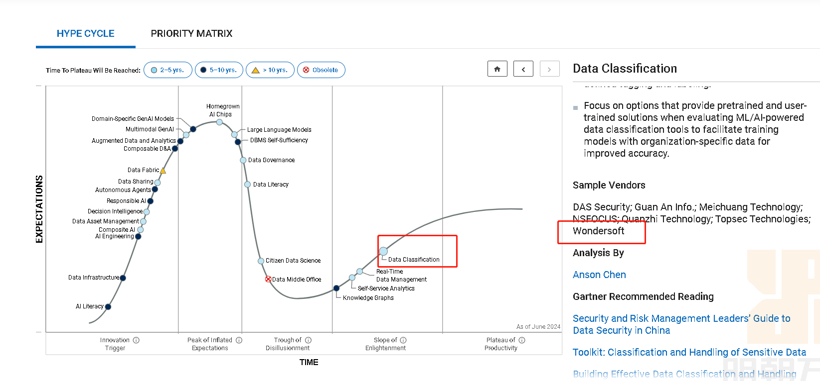 近日,Gartner發(fā)布《Hype Cycle? for Data, Analytics and AI in China, 2024》報(bào)告。繼2023年后,明朝萬(wàn)達(dá)再度入選“數(shù)據(jù)分類(lèi)分級(jí)領(lǐng)域(Data Classification)”代表供應(yīng)商名錄。這既是明朝萬(wàn)達(dá)技術(shù)能力的實(shí)力見(jiàn)證,也是業(yè)內(nèi)權(quán)威與中國(guó)市場(chǎng)對(duì)明朝萬(wàn)達(dá)的持續(xù)認(rèn)可。