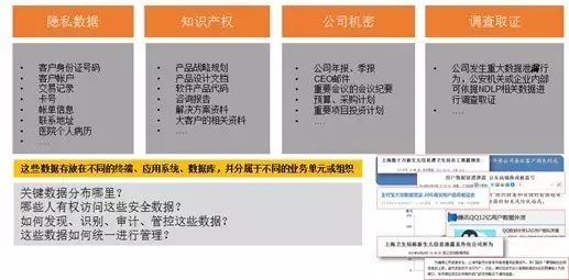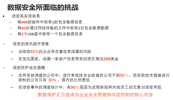 企業(yè)內(nèi)部的關(guān)鍵數(shù)據(jù)非常多,包含企業(yè)最終客戶信息的個(gè)人隱私數(shù)據(jù)、企業(yè)內(nèi)部的知道產(chǎn)權(quán)數(shù)據(jù)、企業(yè)重大戰(zhàn)略投資投策公司機(jī)密信息,這些構(gòu)成了企業(yè)最重要的數(shù)據(jù)資產(chǎn),這些數(shù)據(jù)存放在不同的終端設(shè)備、應(yīng)用系統(tǒng)、數(shù)據(jù)庫(kù)系統(tǒng),并且分屬于不同的業(yè)務(wù)單元或部門組織進(jìn)行管理,任何信息的泄漏,都可能造成企業(yè)無法估計(jì)的損失。