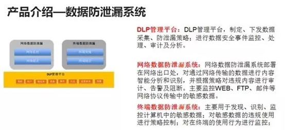 3、DLP管理平臺(tái):實(shí)現(xiàn)企業(yè)安全策略的制定、下發(fā),完成終端及網(wǎng)絡(luò)數(shù)據(jù)的采集、分析、監(jiān)控、審計(jì)、預(yù)警等功能。