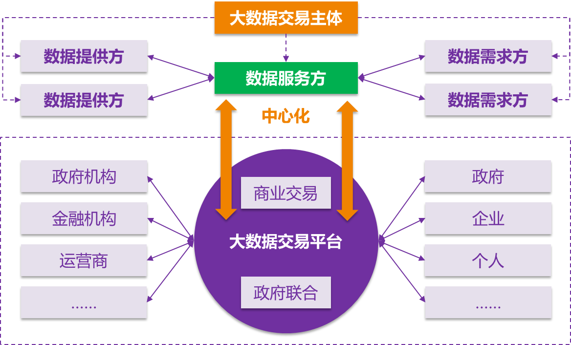 國內(nèi)大數(shù)據(jù)交易平臺主要可以分為兩類:一類是以數(shù)據(jù)生產(chǎn)或數(shù)據(jù)服務(wù)類企業(yè)為主導(dǎo)、商業(yè)職能為主的大數(shù)據(jù)交易平臺,另一類是政府聯(lián)合其他主體投資、合作的大數(shù)據(jù)交易平臺。大數(shù)據(jù)交易平臺大多采用中心化系統(tǒng)結(jié)構(gòu),大數(shù)據(jù)交易主體包括數(shù)據(jù)提供方、數(shù)據(jù)服務(wù)方、數(shù)據(jù)需求方,數(shù)據(jù)提供方很少直接面對數(shù)據(jù)需求方,數(shù)據(jù)服務(wù)方在整個大數(shù)據(jù)流通和交易過程中,中心支配地位突出。