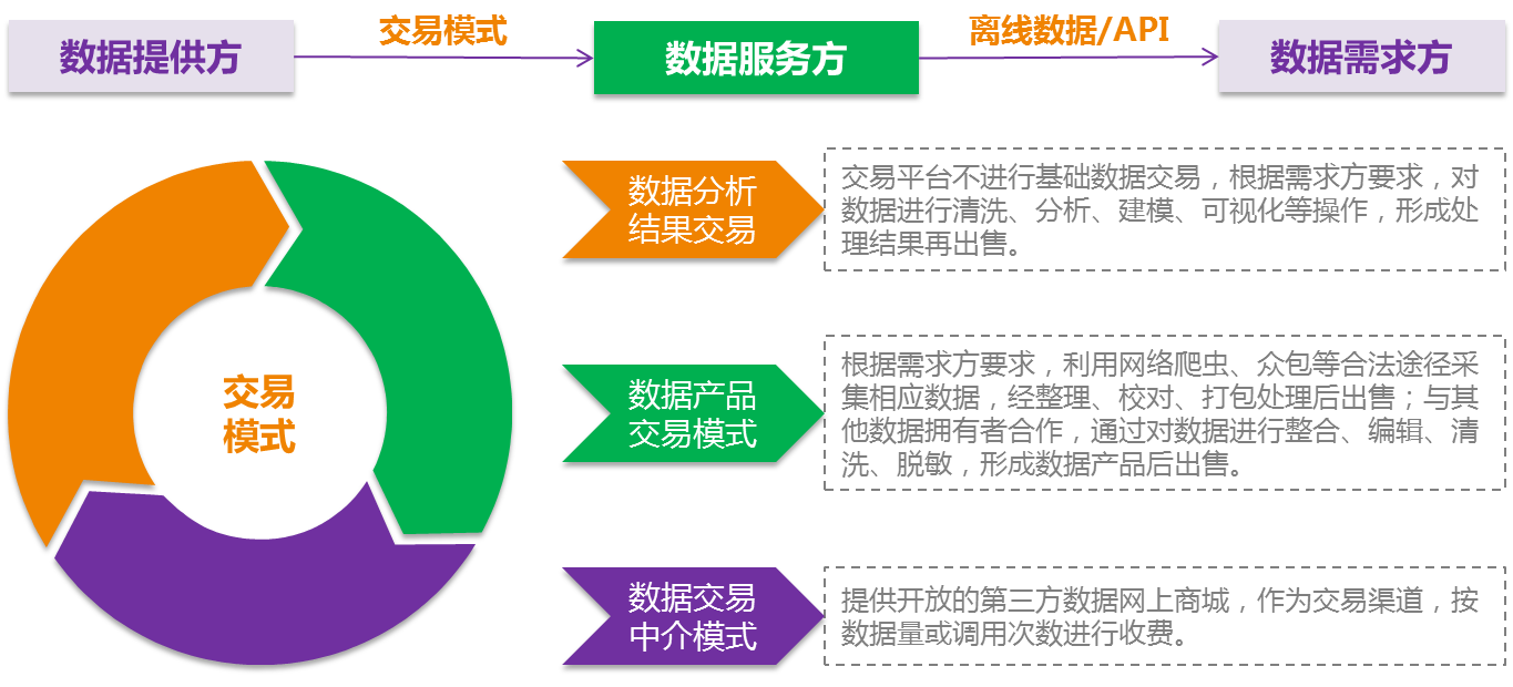 大數(shù)據(jù)交易平臺采用數(shù)據(jù)分析結(jié)果交易、數(shù)據(jù)產(chǎn)品交易和數(shù)據(jù)交易中介等三種交易模式,最終數(shù)據(jù)服務(wù)方采用離線數(shù)據(jù)或API等方式將交易數(shù)據(jù)提供給數(shù)據(jù)需求方。