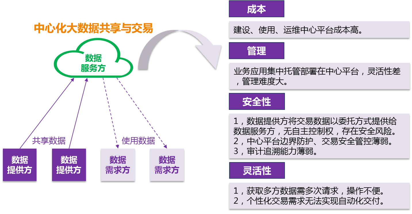 國內(nèi)大數(shù)據(jù)交易處于初期階段,部分大數(shù)據(jù)交易平臺制定了大數(shù)據(jù)交易規(guī)則,對交易平臺、交易主體、交易對象進(jìn)行規(guī)范,屬于探索性質(zhì)。針對大數(shù)據(jù)交易共性敏感問題,缺乏全面、權(quán)威、有公信力的解決方案。在中心化系統(tǒng)結(jié)構(gòu)下,大數(shù)據(jù)交易存在成本、管理、安全性、靈活性等方面的問題難以突破,對大數(shù)據(jù)安全共享與交易形成了挑戰(zhàn)。