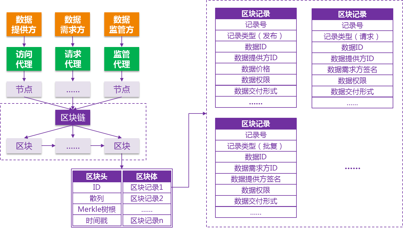 區(qū)塊鏈中每一個區(qū)塊包含多個區(qū)塊記錄,區(qū)塊記錄包括發(fā)布、請求、批復(fù)等記錄類型。
