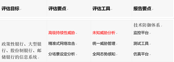 【針對安全的部分,文件要求】政策性銀行、大型銀行、股份制銀行、郵儲銀行還要針對高級持續(xù)性威脅、精準式網(wǎng)絡(luò)攻擊進 行安全評估,對威脅和攻擊進行分類場景設(shè)定,有針對性的排查系統(tǒng)漏洞、分析脆弱性,形成應(yīng)對此類攻擊的防護措施專項評估報告。