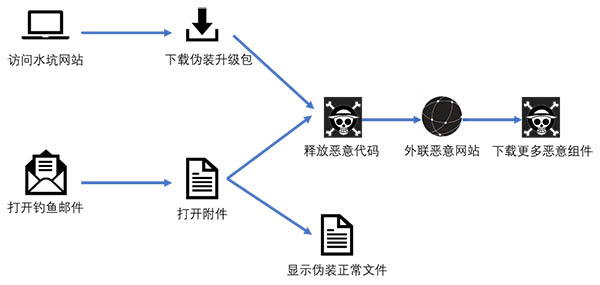 水坑攻擊:當訪問者訪問互聯(lián)網(wǎng)上的鏈接時,有可能會訪問到水坑網(wǎng)站,如偽造的某銀行的官網(wǎng),該網(wǎng)站會提示瀏覽器端的FLASH組件需要更新,此時訪問者由于對該銀行的信任而下載偽裝的升級包,升級包下載完成之后,會像正常的升級包一樣在客戶端進行安裝,而該文件在后臺則會釋放惡意代碼,惡意代碼會外聯(lián)惡意網(wǎng)站并取得聯(lián)系,外部的APT攻擊組織接收到信息后,則會遙控下載更多的惡意組件,并對企業(yè)內(nèi)部網(wǎng)絡(luò)進行攻擊、信息收集,進而造成企業(yè)重大損失。