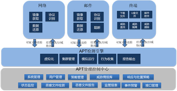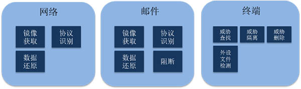 產(chǎn)品全面覆蓋網(wǎng)絡(luò)、郵件、終端三個不同的渠道,全面檢測APT攻擊,并進行威脅協(xié)同處理;