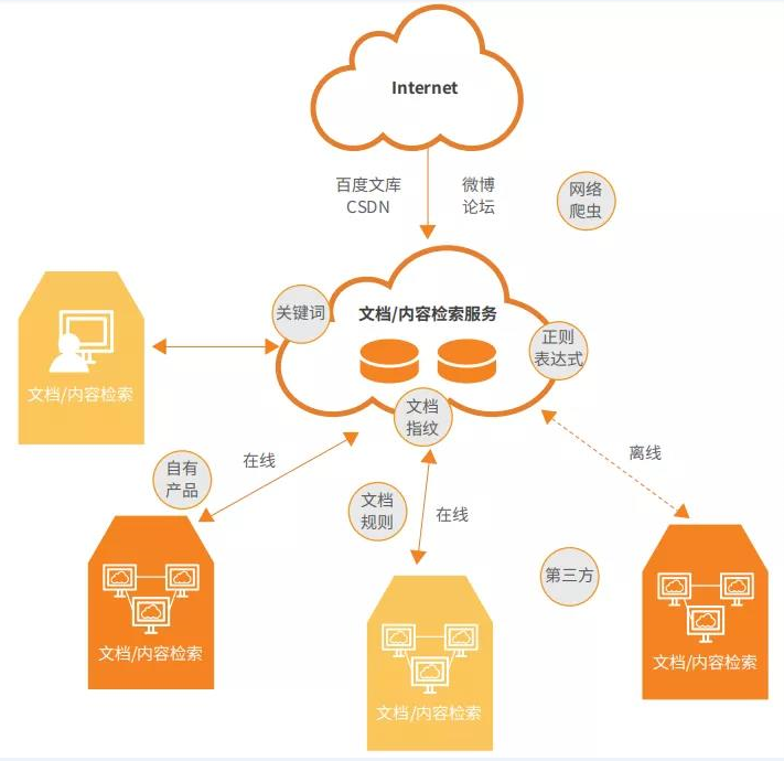 系統(tǒng)的物理部署架構(gòu)如上圖所示,云端部署大數(shù)據(jù)存儲(chǔ)和檢索平臺(tái),同時(shí)通過(guò)網(wǎng)絡(luò)爬蟲從互聯(lián)網(wǎng)重點(diǎn)網(wǎng)站爬取文本內(nèi)容和非結(jié)構(gòu)化文檔內(nèi)容,信息經(jīng)過(guò)清洗加工后存儲(chǔ)到云端。通過(guò)Web或接口對(duì)外提供單次或批量的數(shù)據(jù)檢索服務(wù)。