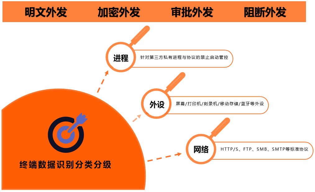◆ 以終端全方位的數(shù)據(jù)外發(fā)通道管控為基礎(chǔ),實現(xiàn)針對終端各種類型外設(shè)如移動存儲設(shè)備、打印機、刻錄機、藍牙等設(shè)備外發(fā)數(shù)據(jù)的管控;同時還支持針對終端網(wǎng)絡(luò)通道各種標準協(xié)議如HTTP/S、FTP、SMB、SMTP、SSL加密等外發(fā)數(shù)據(jù)的管控。針對第三方私有協(xié)議的即時通訊軟件外發(fā)途徑支持采用進程禁止啟動的方式進行管控。支持添加屏幕水印等輔助措施實現(xiàn)對數(shù)據(jù)通過屏幕泄漏的途徑管控。