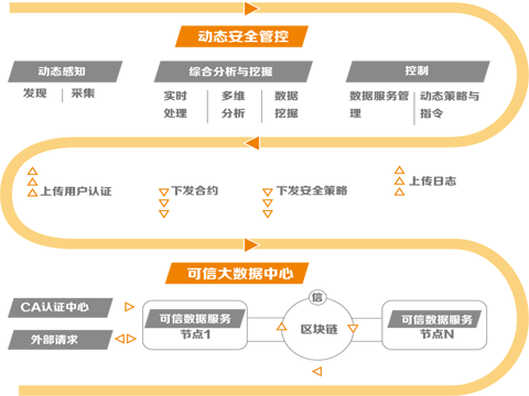 動(dòng)態(tài)安全管控實(shí)現(xiàn)服務(wù)節(jié)點(diǎn)的數(shù)據(jù)感知、綜合分析與挖掘、合約的建立與下發(fā)、安全策略制定與下發(fā)等功能。