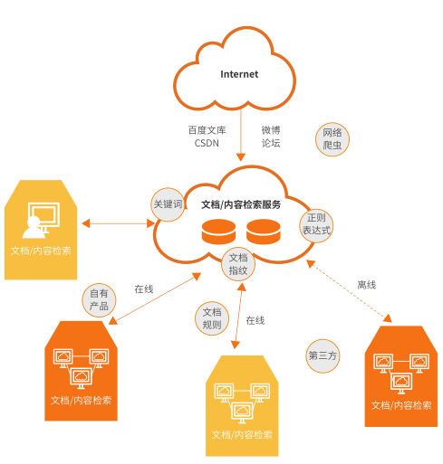 產(chǎn)品通過SaaS模式對外提供服務為客戶提供互聯(lián)網(wǎng)上的文檔泄漏監(jiān)測服務,數(shù)據(jù)可以通過服務接口進行調用。通過文檔內容檢索引擎,為企業(yè)用戶提供特定互聯(lián)網(wǎng)網(wǎng)站上文檔內容的檢索功能。