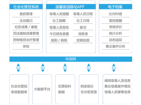 吸毒人員社會(huì)化管控系統(tǒng)將公安、街道和鄉(xiāng)鎮(zhèn)人民政府、司法部門、衛(wèi)生部門的禁毒工作納入統(tǒng)一信息化軌道,為減少毒品危害,推進(jìn)社會(huì)管理工作創(chuàng)新提供技術(shù)支撐,并在建設(shè)吸毒人員社會(huì)化管控系統(tǒng)的基礎(chǔ)上,實(shí)現(xiàn)與其他數(shù)據(jù)資源對(duì)接、完善吸毒人員信息、建立電子檔案,進(jìn)一步加強(qiáng)對(duì)吸毒人員的管理。同時(shí)為社區(qū)戒毒(康復(fù))工作建設(shè)移動(dòng)APP,大大降低社工工作時(shí)間和工作量,解放人力。
